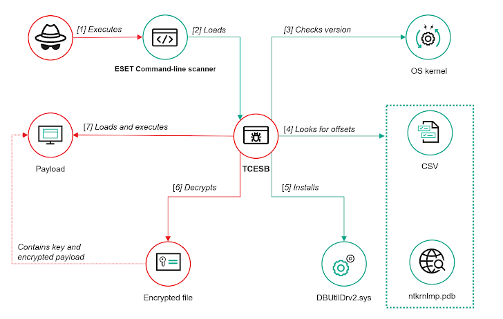 TCESB itself is a modified version of the open-source tool EDRSandBlast, enhanced to disable operating system kernel notification routines—callbacks designed to alert drivers of events like process creation or registry changes. To achieve this, TCESB employs a bring-your-own-vulnerable-driver (BYOVD) technique, installing a vulnerable Dell driver, DBUtilDrv2.sys, which contains a known privilege escalation flaw (CVE-2021-36276). This mirrors tactics seen in 2022 when the Lazarus Group exploited another Dell driver vulnerability (CVE-2021-21551) for similar purposes.